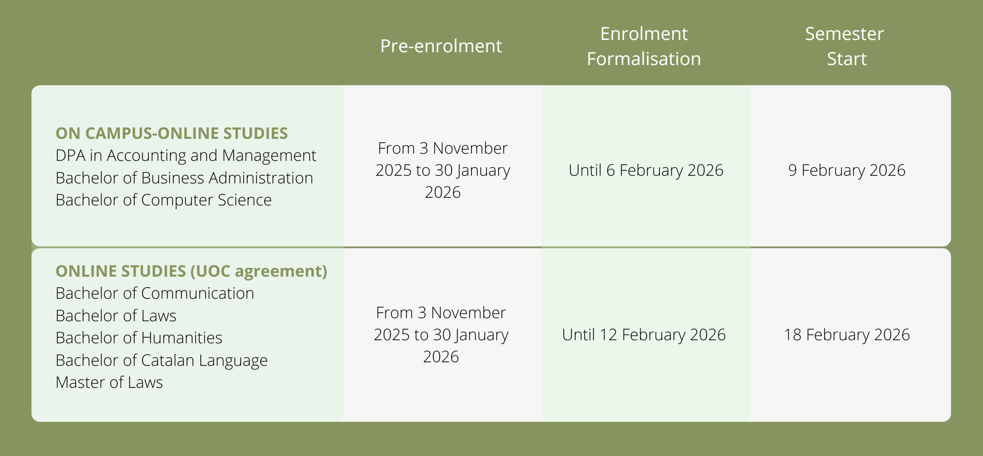 To begin studies in February (the spring semester), pre-enrolment takes place from November to late January (depending on the degree) and the enrolment must be completed by the start of the semester in February.