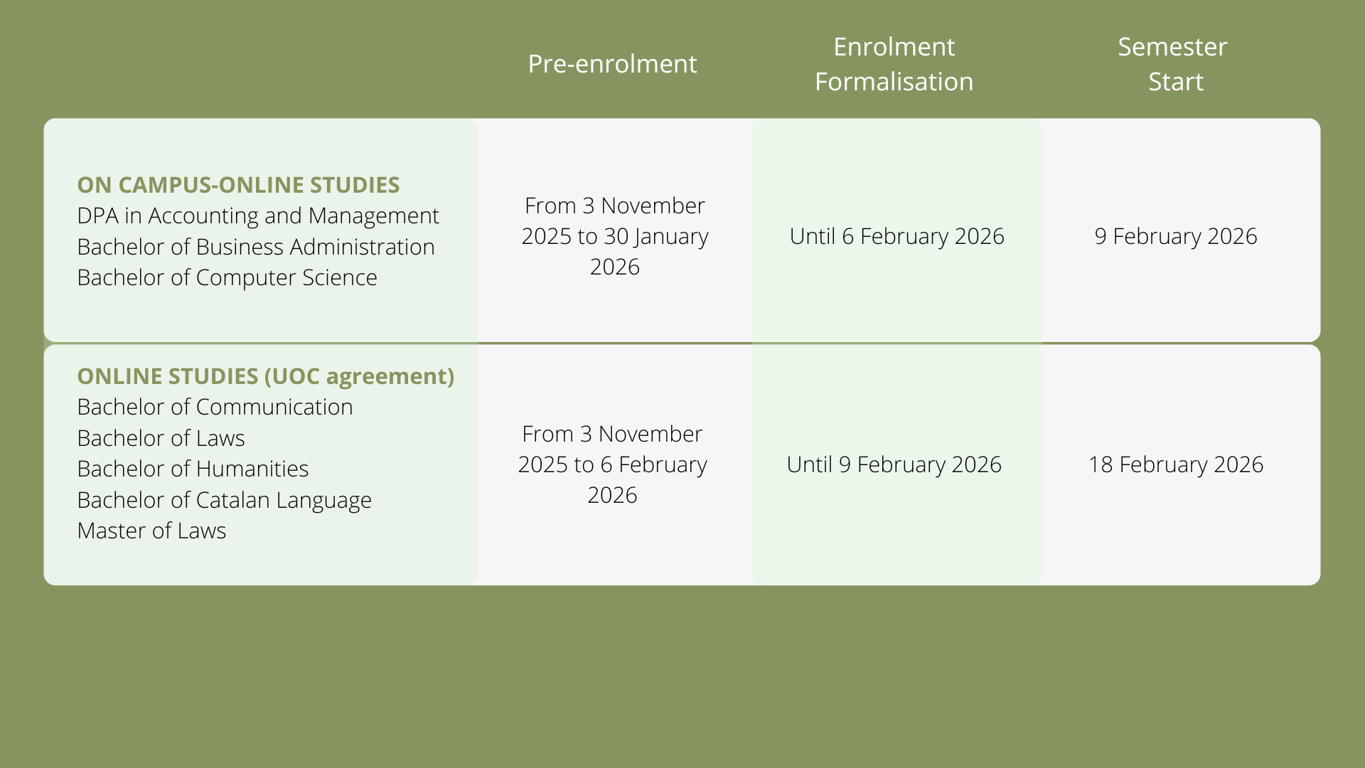 To begin studies in February (the spring semester), pre-enrolment takes place from November to late January (depending on the degree) and the enrolment must be completed by the start of the semester in February.