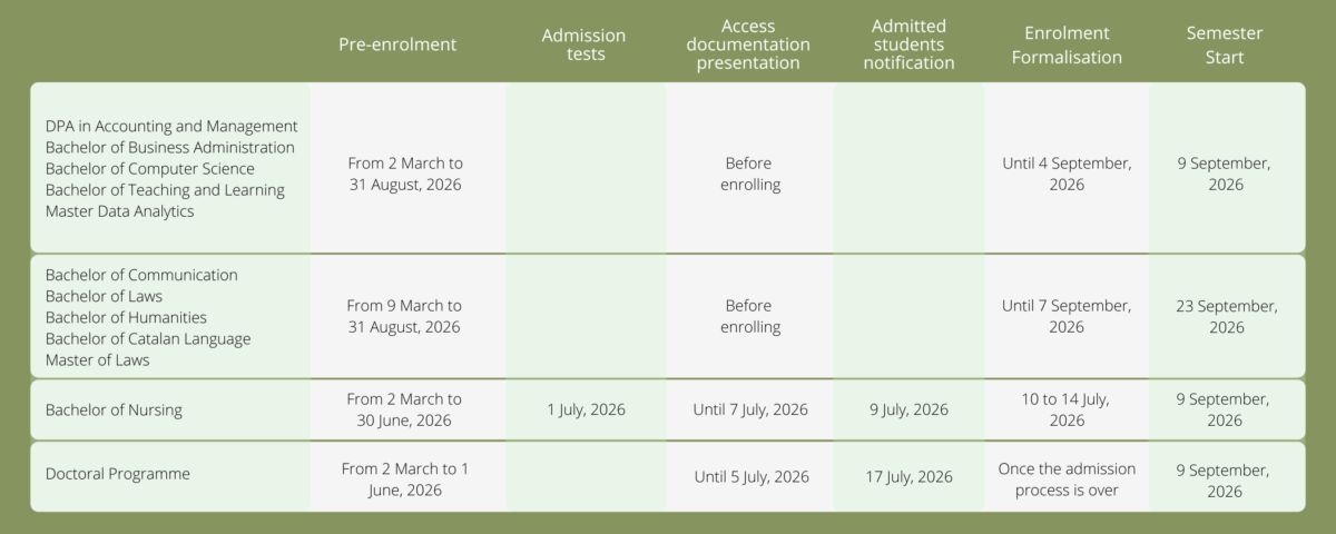 Pre-enrolment to study any of the courses on offer at the University of Andorra is performed online via the pre-enrolment form within the deadlines established for each degree. Pre-enrolment is a procedure that is free of charge and does not entail an ultimate commitment to enrol.
